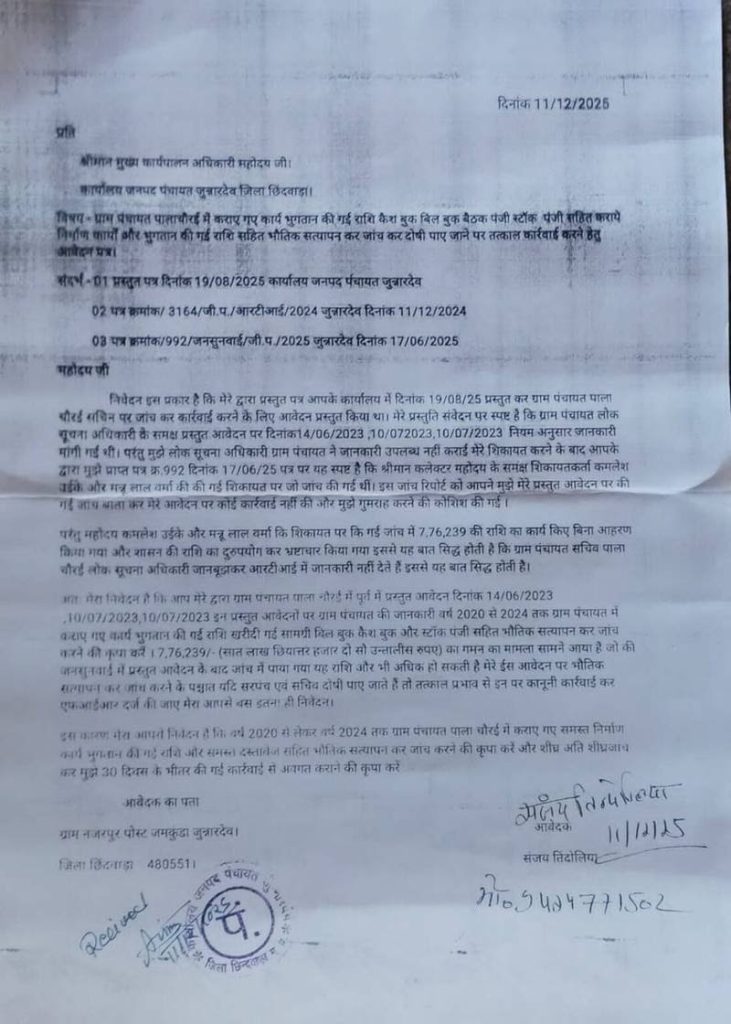 “मांगी गई जानकारी के बिंदु:2020-2024 तक सभी निर्माण कार्य और भुगतान किए गए बिल कैश बुक, बिल बुक और स्टॉक पंजी और बैठक पंजी का भौतिक सत्यापन कर निर्माण कार्य और भुगतान कि गई राशि जांच कि मांग कि है जिला कलेक्टर से अपील की है कि तत्काल जांच टीम गठित हो।